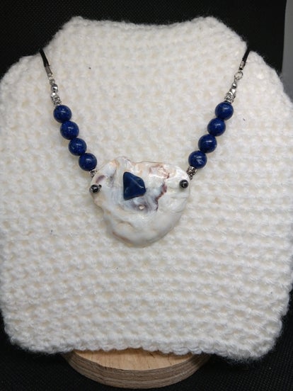 En coquille huitre, hématite, oeil du tigre, lapis lazulis