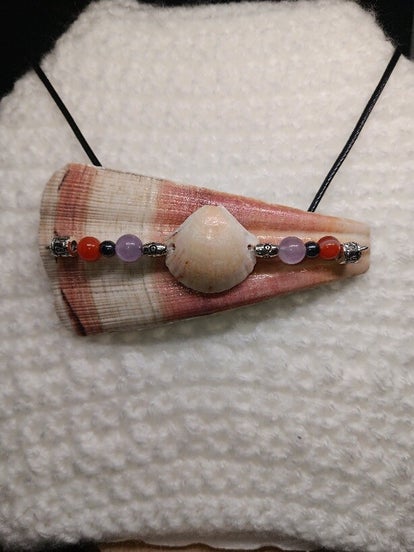 En coquille Saint Jacques, améthyste, agate rouge, hématite